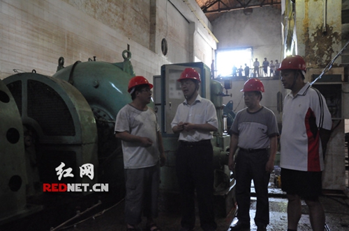 黄土溪水库发电车间。地下的轮机房阴暗湿冷,胡佳武(左二)在询问受损情况。