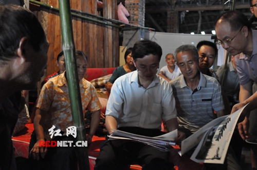 石眼潭村集中安置点。胡佳武为村民们展示讲解重建规划和房屋设计图,还有“好几种(房屋设计)式样供大家挑”。