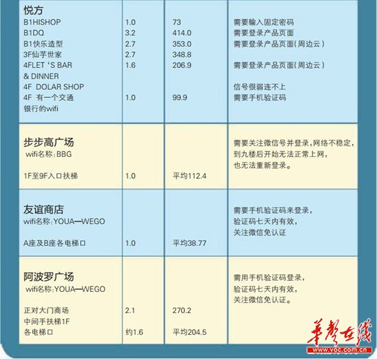 除了平和堂五一店、悦方ID Mall、奥克斯广场以及新世界百货4家商场没有全场覆盖wifi外,袁家岭友谊商店、阿波罗商业广场、友阿春天、步步高广场长沙店、长沙万达开福广场、王府井百货、乐和城内均有免费wifi覆盖。