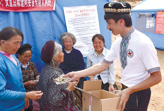 ▲8月7日,“切糕王子”买买提在鲁甸县龙头山镇向地震受灾群众发放切糕。 新华社 图