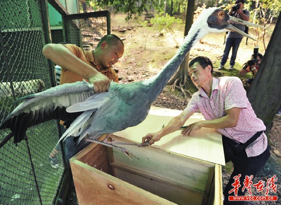 9月28日,鸟语林的饲养员齐师傅将白枕鹤送进箱中。 记者 童迪 摄