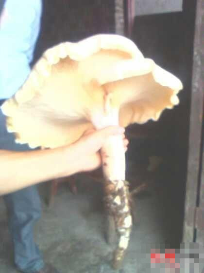 和普通蘑菇比,巨型蘑菇大得像一把伞,30厘米直径的菌盖,8厘米直径的菌柄一只手很难握住,吕中义说,一个月前,他偶然上山时发现了这个蘑菇,当时巨型蘑菇在旁边一些小蘑菇中“鹤立鸡群”,长得像灵芝。