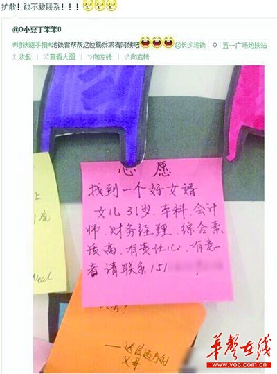 几天前,在长沙地铁2号线五一广场站的心愿墙上,一名长沙母亲写下了她的心愿“找个好女婿”,并附上了对女儿的介绍。然而,这则“征婚启事”贴出4天里却只收到了两个“应聘”电话。对此,这名母亲有着些许疑惑:难道长沙的小伙子都不主动!
