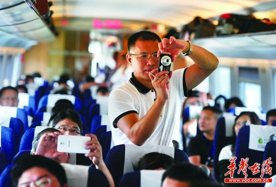 9月16日,旅客纷纷用相机和手机记录下高铁的速度显示。 当天,沪昆高铁长沙至南昌段开通运营。 记者 郭立亮 摄