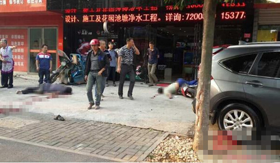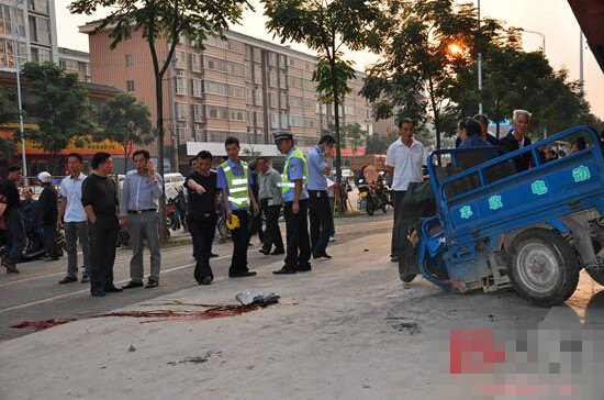 17:10,记者赶到现场看到,一辆本田CRV小车与一辆丰田凯美瑞相撞,一辆三轮摩托车和一辆两轮电动车被撞翻在地,地上残留着大量车辆碎片和血渍,都显示着事故发生时的惨烈。