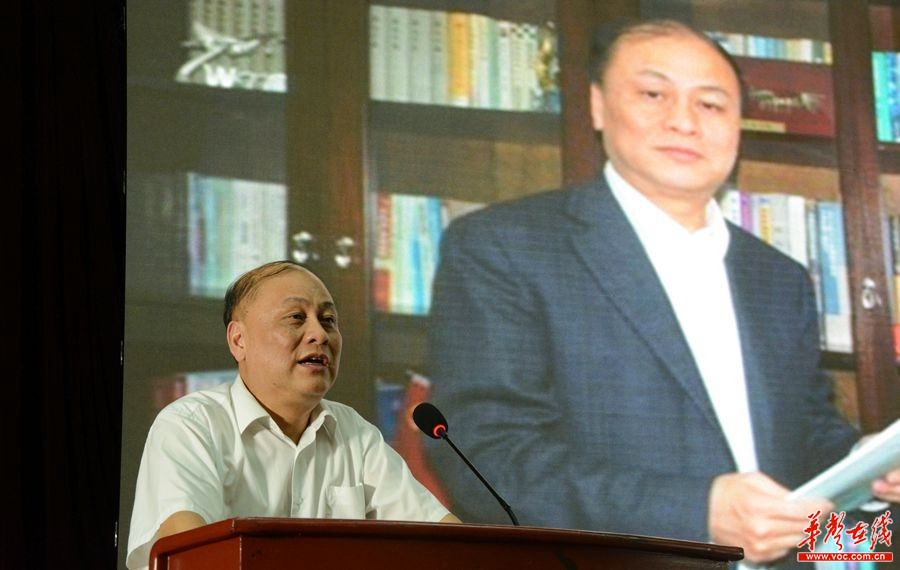 原湖南省人社厅厅长、党组书记、省委组织部副部长,大学语文《三江源赋》作者彭崇谷主讲《从三江源赋看国学精粹》。通讯员 郦峰华 摄