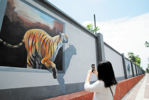 长沙晚报月28日讯(记者 胡益虎 通讯员 盛磊)即将跃出画面的老虎、伸长脖子好奇地探出窗外的长颈鹿、萌态十足的功夫熊猫……近日,一组栩栩如生的3D画亮相星沙开元西路。据悉,这是长沙县按照建设开元路“景观大道”的要求,聘请专业的3D画师对沿线围墙进行的美化处理。