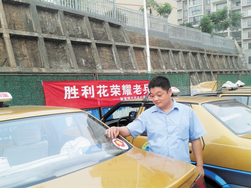 昨日,新里程出租车公司的驾驶员将亲手制作的“胜利花”张贴在车辆上。 长沙晚报通讯员 曾扬 摄