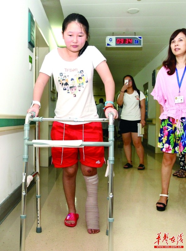今年5月,长沙市望城区12岁的周美玲在渣土车下勇救三岁男童,而自己的左小腿被碾压,严重受损。先后进行了两次足跟、踝关节和跟腱的大型皮瓣移植手术、一次植皮手术和两次清创手术后,小美玲的左腿终于保住了。