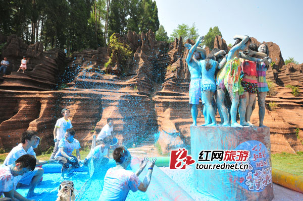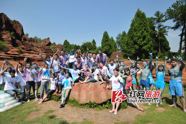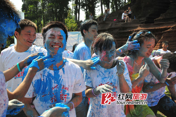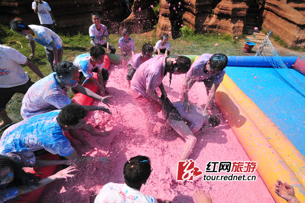 红网湘西8月23日报道(时刻新闻记者 杨烊 摄影 徐行)8月22日至23日,七夕红石林土家摸泥节火热来袭,上千名游客及土家阿哥阿妹齐聚湘西红石林国家地质公园,牵手爱之路,上演一场民俗与时尚结合的摸泥狂欢。