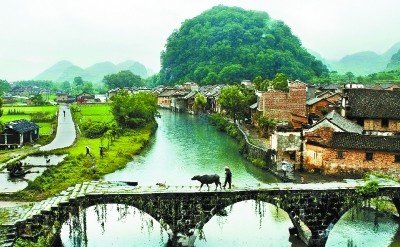 上甘棠古村位于江永夏层铺镇。村前环绕清澈的谢沐河,村后是逶迤远去的屏峰山脉,村西南面是一大片肥沃的良田。独具特色的山水田园景观,构成了一幅青山、绿水、小桥、人家的美丽画卷。