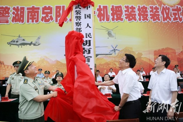 9月22日上午,武警部队司令员王宁上将,省委书记、省人大常委会主任徐守盛,省委副书记、省长杜家毫在湘阴为武警湖南省总队直升机授装接装仪式揭牌 。 新湖南客户端记者 罗新国 摄