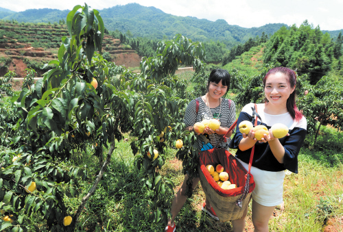 大围山的特色水果种植规模已超过24000亩,黄桃是名副其实的“头牌果王”,这是游客在黄桃园体验采摘之乐。