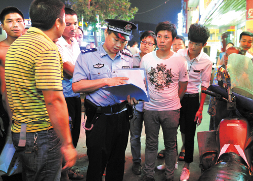 昨晚9时许,在植物园路,冯先明(中)对一名骑摩托车的市民进行询问。长沙晚报记者 王志伟 摄