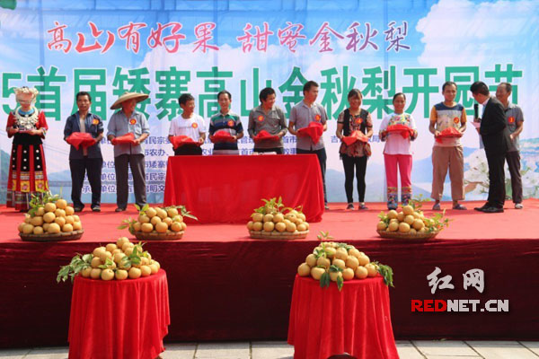 开园仪式上,人们赏猴鼓、听苗歌、赛梨王,好不热闹,“梨王”评比环节最引人瞩目。10位经验丰富的果农,从各自的地里挑下最大的一只金秋梨参与比拼,颗颗色泽金黄,晶莹透亮,外观上难分上下。最后比拼重量,最重的一颗790.99克,获评“金秋梨王”称号。“梨王”拍卖现场,村民、嘉宾、游客纷纷举牌,最终一名邵阳客人出价600元,震惊全场,但一名吉首本地人不敢示弱,最终以650元竞得。