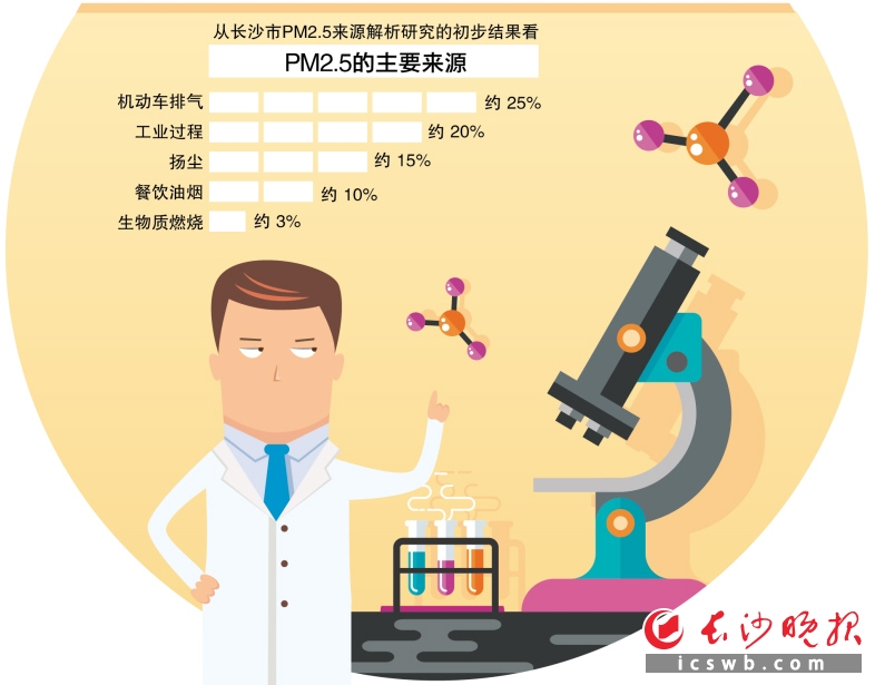 特护期内,长沙市绝大部分时间的空气首要污染物为PM2.5。PM2.5是造成雾霾的主要原因,而从长沙市PM2.5来源解析研究的初步结果看,机动车排气(约占25%)、工业过程(约占20%)、扬尘(约占15%)、餐饮油烟(约占10%)、生物质燃烧(约占3%)是PM2.5的主要来源。