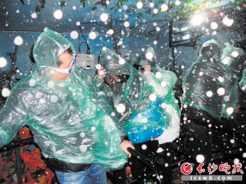 在台风体验馆内,“超强飓风”裹挟着雨水扑面砸来,人们被吹得东倒西歪,不得不用力抓好护栏。长沙晚报记者 周柏平 摄