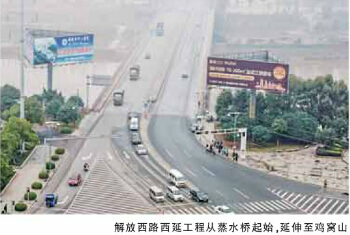 解放西路西延工程将从蒸水桥延伸至鸡窝山,总长5.8公里,总投资3.64亿元。今年计划完成建设投资2.8亿元。规划路幅宽64米,双向6车道。