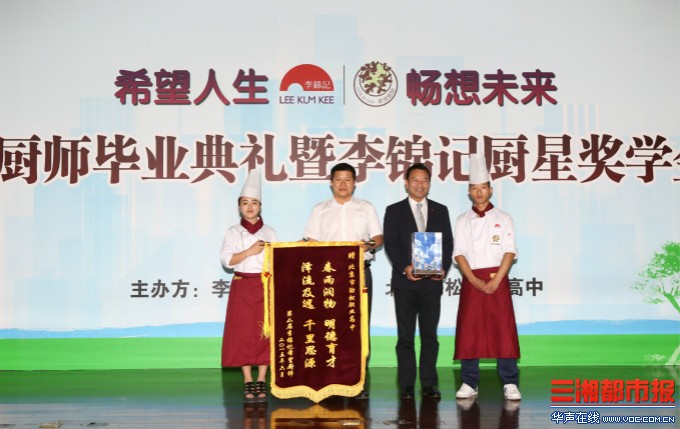 杨梦双(左一)和姬顺国(右一)在毕业典礼上为李锦记和学校献礼