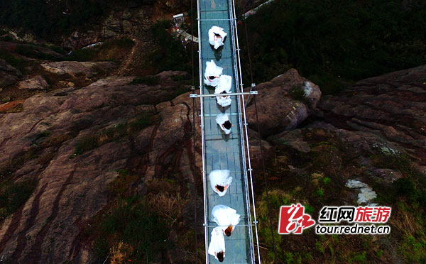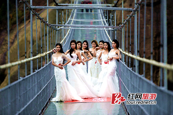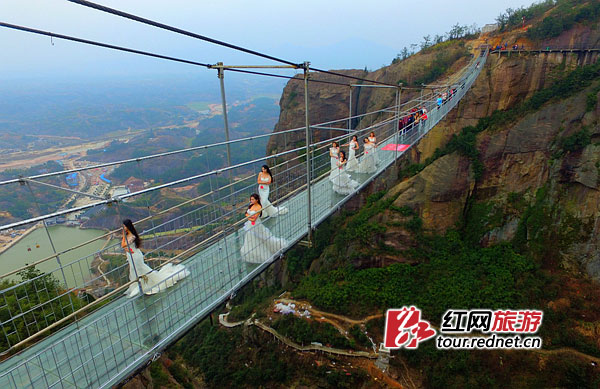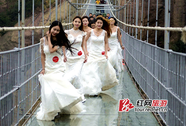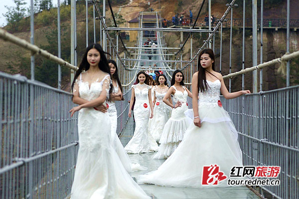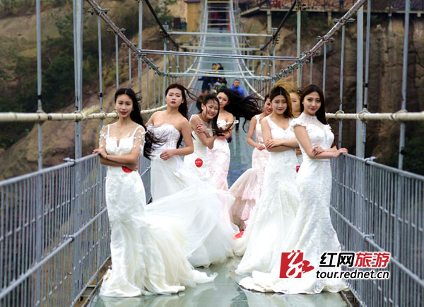 红网岳阳2月14日讯(通讯员 唐哲威 摄影 杨华峰 徐行)湘妹子追求爱情的态度,向来以奔放和热辣出名。今天是情人节,寒冷的天气却挡不住人们的热情,当情侣们各自在朋友圈秀恩爱时,众多美女出现在湖南岳阳石牛寨,并在垂直高度180米的高空玻璃桥上上演婚纱秀。洁白的婚纱,甜美的笑容,惊险的玻璃桥,构成了一幅幅迷人的画卷,为这个浪漫节日再添火热。