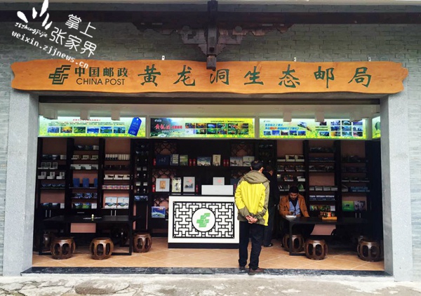 黄龙洞生态邮局为张家界市邮政局景区服务点之一,位于曾获“中国环境艺术奖”的黄龙洞生态广场,占地面积32平方米,墙体古色古香,为石头砖木结构。邮局内设黄龙洞邮资明信片等50余种张家界邮品,主要为海内外游客现场提供信函邮寄、邮品交流等服务。