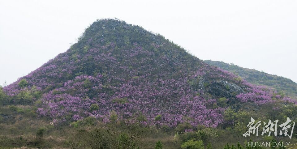 在一座山体酷似螺丝的山脚下,只见盛开的紫荆花群从山脚开到了山顶,树花嫣红如霞,密集爬满枝条,密密麻麻,层层叠叠,像一串串的花环,把整个“螺丝山”装扮成花团锦簇的海洋,磅礴大气,绝美壮观。