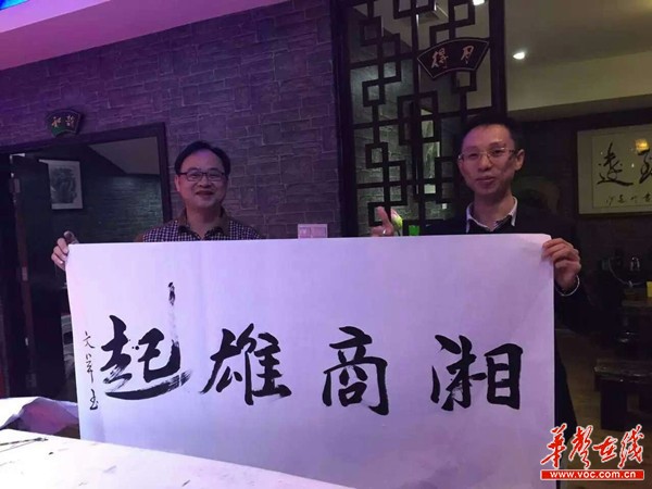 演出最后,观众久久不愿离去。刘毓鳞先生也被大家的热情感染,不辞辛劳,再三加演。我省青年书法家陈文莽先生即席挥毫写下了"精气神""湘商崛起"等字送给本次晩会的全体演员和湖南湘商刘潭兵、刘兴军共同庆祝"三八"妇女节。