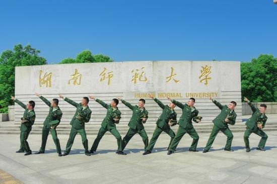 湖南师范大学的国防生在校碑门口拍毕业照,摆出“走起”的造型。 图/晨报摄友团管冯瑞