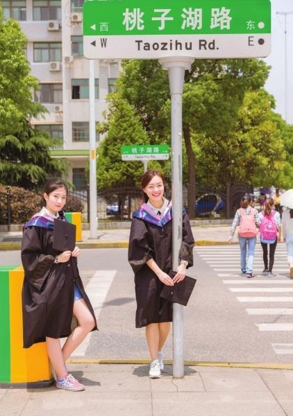 湖南师范大学2012级毕业生杨姝(左)和吴江楠在桃子湖路口拍毕业写真。图/晨报摄友团杨东旭