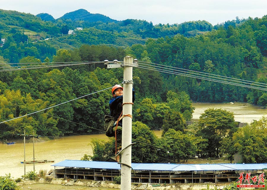 5月7日,龙山县召市镇方坡村,技术人员冒雨抢修损坏的电缆。当天,该县境内骤降暴雨,多处道路良田被淹,电力设施受损严重。国网龙山县供电公司调动所有技术人员全力开展抢险救灾工作。截至当日17时,该县境内因暴雨停运的11条10千伏线路,主线路已全部恢复供电。田昌平 邓德志 摄影报道