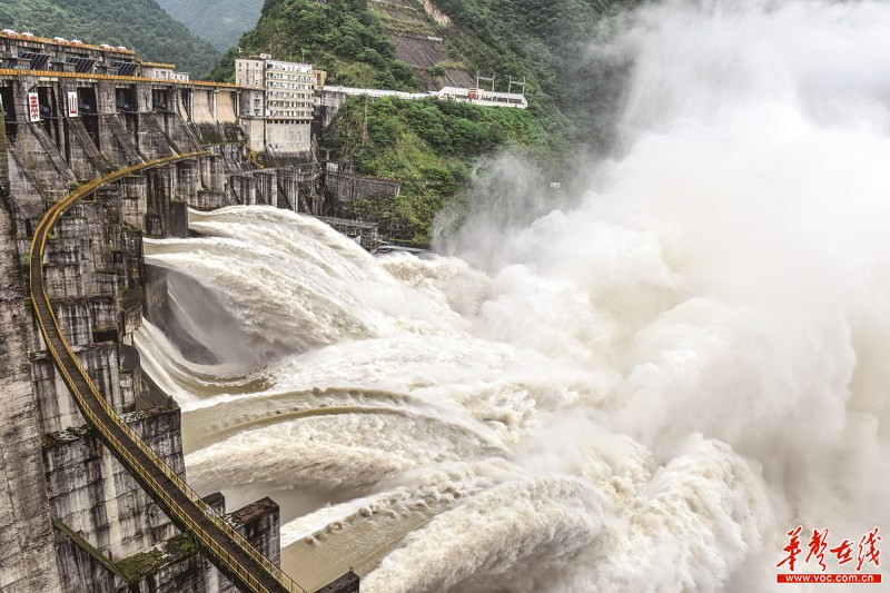 受酉水流域上游龙山县等地特大暴雨影响,6月20日上午,凤滩水库最大入库流量达到每秒13800立方米。21日,凤滩水库开启10孔闸门泄洪,缓解上游来水压力。 瞿宏红 摄