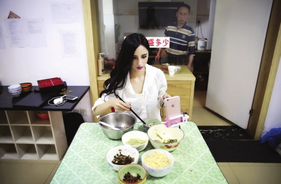 6月6日,辛苦拍摄了半天,吴春怡就在摄影工作室稍显简陋的食堂吃饭,借助自拍杆,她可以随时在直播平台上做网络视频直播。
