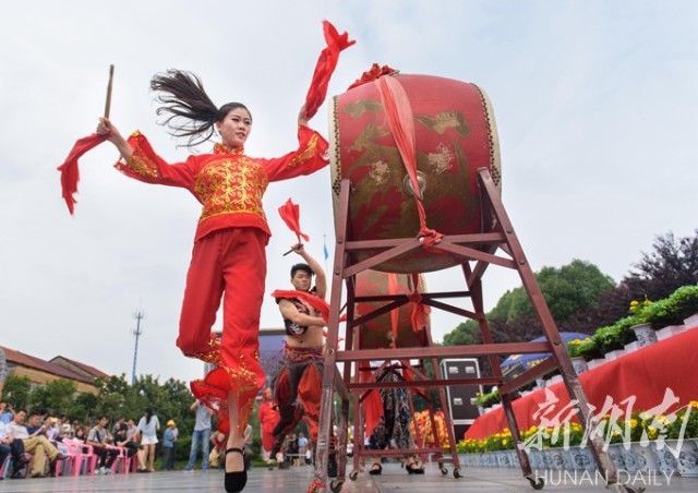 6月12日,临澧县合口镇,村民在表演击鼓。当天,“美丽合口”古镇摄影大赛启动。合口镇是一座拥有千年历史的商埠古镇,湘西北文化别具一格。2015年,合口镇被省住建厅评为首批“湖南省美丽乡镇示范镇”。