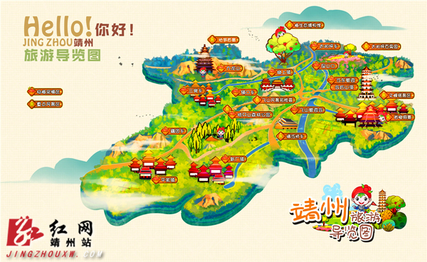 不同于一般严格按照比例尺绘制的旅游图,该地图色彩鲜艳、造型卡通,风格非常萌。地图上近32栋少数民族风格建筑,10多条马路,从地笋苗寨、九龙山到岩脚侗寨、文峰塔,从太阳岛上百果园到飞山公园、排牙山,靖州大大小小各处景点图上一目了然、栩栩如生。这张导览图充分考虑了“吃货们”的要求,准确地标识出了靖州12个杨梅集中产地。手持这份地图,吃的问题、玩的问题不用愁了,因为现有的每一个杨梅采摘区,每一个重点风景区,“萌萌哒”的“杨梅阿妹”都在那儿候着呢,而且她还按照服务水平给评定了星级。有了“杨梅阿妹”的贴心服务,靖州旅游导览图不仅仅是旅游地图,更成了玩转靖州杨梅节的“万宝全书”。