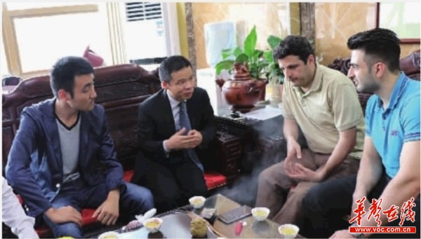 钟高明(左二)与来访的伊朗客户洽谈合作。