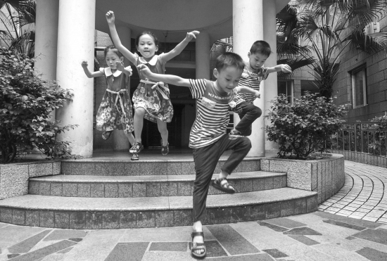 7月6日,在幼儿园,记者见到了“龙凤吉祥”。一样的凉鞋,老二凤凤和老四祥祥穿着一样的粉花色连衣裙,老大龙龙和老三吉吉则穿着一样的条纹衫。