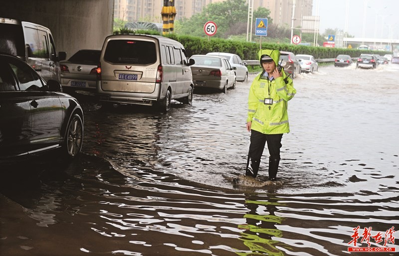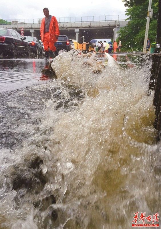 7月4日,长沙市雨花区长沙大道与京港澳高速桥洞下,交警部门在现场指挥交通(上图)。市政人员在紧急排水抢险(下图)。