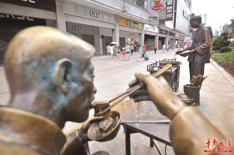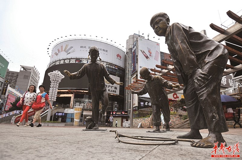 7月1日上午,长沙市黄兴南路步行街,市民从“老长沙”雕塑边走过。该街道以全新面貌迎四方来客。记者 田超 摄