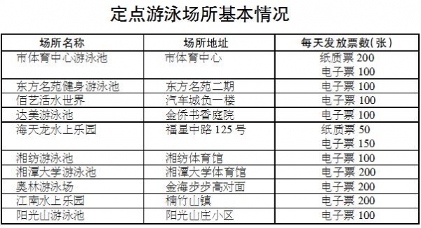 今年,湘潭采取政府购买服务的方式,选择了10家游泳场所开展全市中小学生暑期免费游泳健身活动。这10家游泳场分别是市体育中心游泳池、佰艺活水世界、东方名苑健身游泳池、金侨达美游泳池、海天龙水上乐园、湘纺游泳池、湘潭大学游泳池、奥林游泳场、江南水上乐园、阳光山庄游泳池。开放时间为7月15日至8月23日,共40天。具体时间为每天14:00—18:00;其中市体育中心游泳池开放时间为每天10:00-12:00及14:00-18:00。