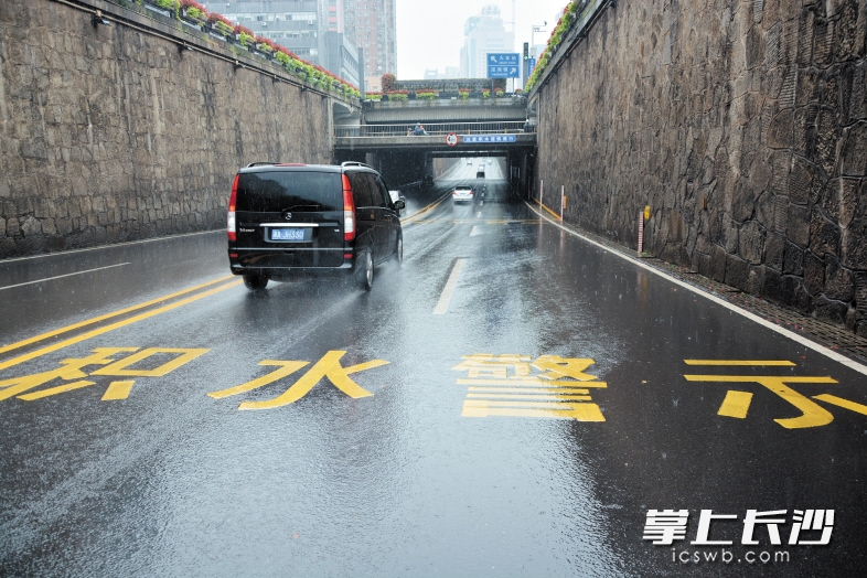 前日,天空正下着大雨,在袁家岭立交桥南北下穿车行通道,车辆从设置积水警示标识的涵洞安全通过。长沙晚报记者 王志伟 通讯员 周正 摄影报道