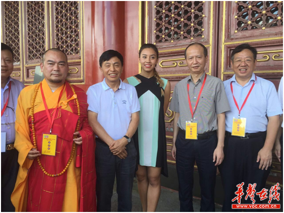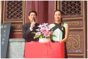 活动中,两位主持人非常吸人眼球,一位是在湖南家喻户晓的著名主持人李兵,另一位是一位外国美女。令人惊叹的是,除了开场一句英文自我介绍外,她都是一口流利标准的中文,而且没出什么差错,说到对佛教的理解,也很到位,得到了中国佛教协会副秘书长、湖南佛教协会副会长、天门山寺方丈怀梵大和尚的肯定、认同。活动结束后,大家争相与她合影留念,她都是笑脸相迎,姿态谦和。