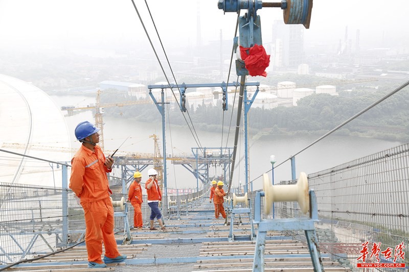 8月22日,大岳高速洞庭湖大桥施工现场,施工人员正在架设主缆。记者 徐典波 摄