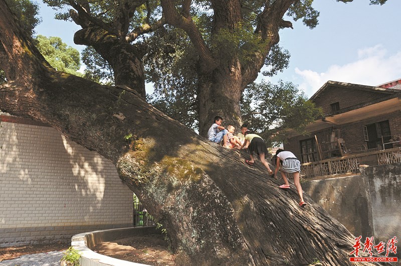 8月21日,道县祥霖铺镇祥霖铺村,小孩子在1500年树龄的古香樟树上玩耍。