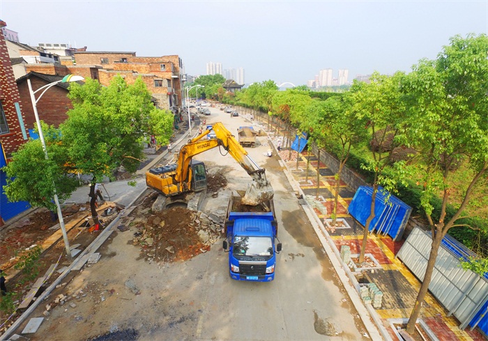 施工车辆正在清理施工后产生的垃圾,为路面铺沥青做好准备。