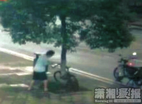 8月8日凌晨,一名环卫工在长沙县西霞路石塘路口清扫卫生时,发现有棵香樟树被锯断。相关部门调取监控发现,是一名男子为了取走锁在香樟树上的山地车,将树拦腰锯断。