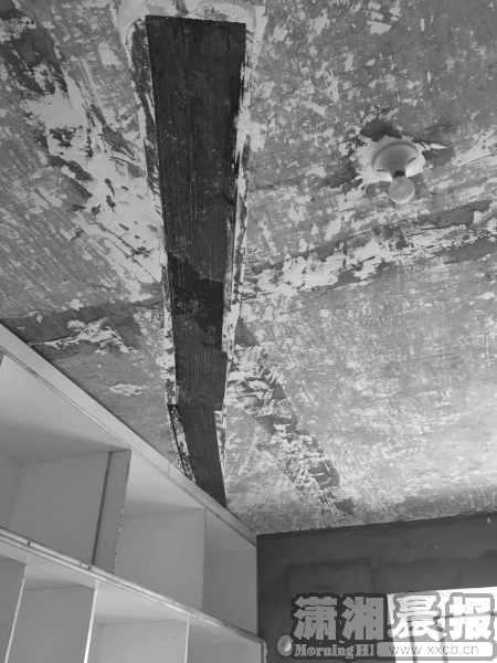 7月26日,长沙五矿紫湖香醍小区,市民范拾平在28栋顶楼买了套房子,装修工人把开发商之前的腻子灰铲掉后发现屋顶出现多处裂纹。图/记者刘李