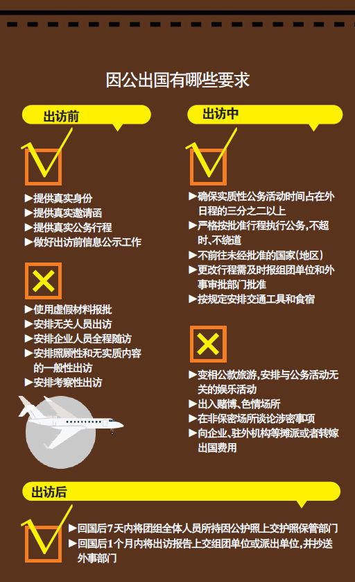 《团长责任告知书》要求,因公出国不能安排照顾性和无实质内容的一般性出访,不安排考察性出访,确保团组出访目的明确、任务充实。不得安排无关人员出访,不安排企业人员全程随访,确保团组人员结构合理、人事相符。督促组团单位提供真实的身份、真实的邀请函和真实的公务行程,不使用虚假材料报批任务。确保实质性公务活动时间占在外日程的三分之二以上,不变相公款旅游,不安排与公务活动无关的娱乐活动。