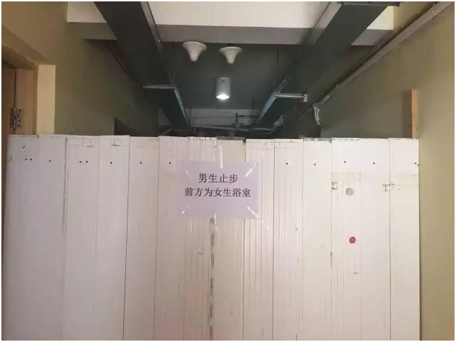 男女浴室间被一块高1.9米的挡板隔开,图为浴室之间男生侧的挡板。