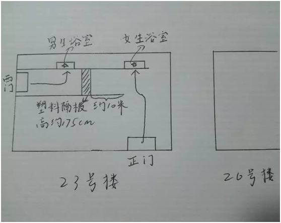 23号楼的面积稍大于其他上外学生公寓,供学生淋浴的大浴室和小浴室均位于一楼,大浴室临近正门,小浴室临近宿舍楼西门。两个浴室原来经一楼走廊相通,自允许留校男同学进入小浴室淋浴后,两浴室之间已被一块高1.9米的挡板阻断,而挡板与女生大浴室入口相距约16米,且二楼西侧到达一楼的门也已经被封住,大、小浴室互不相通。