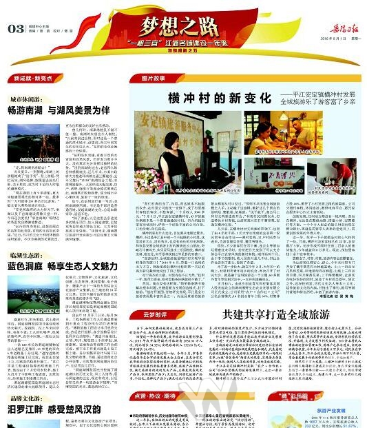 ——县域旅游异军突起。屈子文化园屈原管理区开工、洞博馆和洞庭欢乐世界在君山区奠基,平江涌现出石牛寨、纯溪小镇等一批火爆旅游景区,旅游品牌建设如火如荼;汨罗市普德大庙景区、平江县天岳幕阜山景区成功创建国家3A级旅游景区,汨罗市“闵家新村”、湘阴县“老湘阴”、君山区“杨伙计”成功创建省级乡村旅游区(点),推动评定国家首批乡村旅游“千千万万”品牌,中国乡村旅游模范户3户、中国乡村旅游金牌农家乐12家、中国乡村旅游致富带头人20人,旅游品牌创建成效显著;